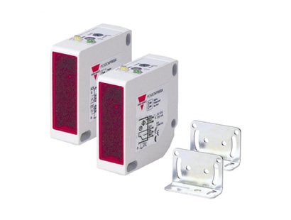 Through-beam, relay output photoelectric sensors in rectangular body PC/ABS (17x50x50 mm). Integrated switch for mode selection (dark or light) and range adjustment potentiometer. Mounting bracket in delivery contents.