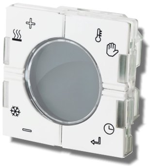 Temperature controller with display, 4 buttons and 4 LEDs. It is developed to be mounted into a 44x44mm and 55x55mm wall socket. The TEMDIS display can manage 6 automatic setpoints (3 for heating and 3 for cooling) and one manual setpoint to let the user manage in the most comfortable way the temperature in his home. Also shows current room temperature, floor temperature and outdoor temperature.
