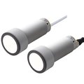 Ultrasonic sensors M30 plastic body with Ø40 front with sensing up to 6 m. There is microprocessor control of the digital filtering that makes the sensor immune to most electromagnetic interferences and the output is one analog (positive or negative slope) and one digital output. On the body of the sensors there is a teaching button for the programming of function, outputs etc.