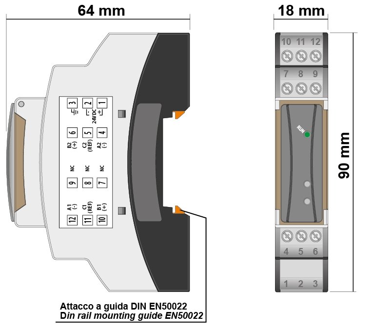 NET485 is conceived as a repeater to amplify signal on RSS485 networks allowing to increase distances, providing also galvanic isolation to prevent possible ground loops with power supply.
