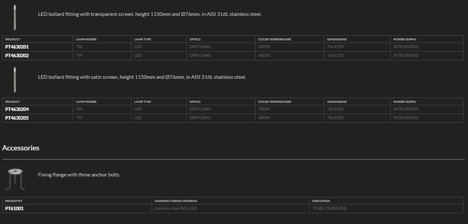 Bollard luminaires in stainless steel AISI 316L. With its minimal, evergreen design and its diffuse lighting it is ideal for gardens and parks.