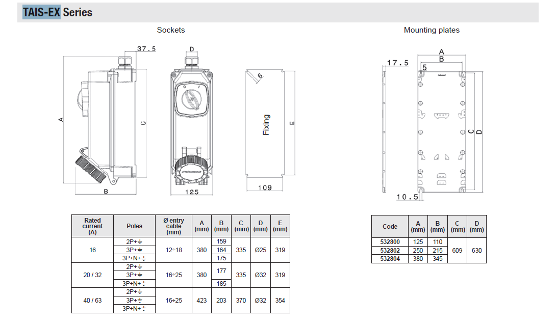Wall-mounted interlocked sockets TAIS-EX series suitable for Zones 21-22(Dust) or 2 (Gas)