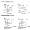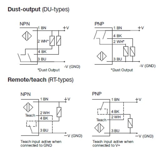 Reinforced PMMA/ABS housing (10 x 30 x 20 mm) DC polarized retro-reflective photoelectric sensors. There is a Teach-In button for adjustment the type of output and the sensitivity, but the user also can remote teach the settings of the photoelectric sensor via a cable (e.g. a PLC).