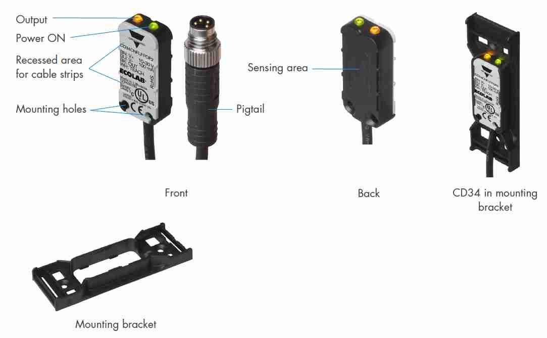The CD34.. sensor offers a highly reliable detection of media such as water, syrup, milk, body fluids (blood) as well as acid or alkaline solutions with a conductivity as high as 50 mS/cm.