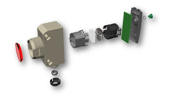 ABS cylindrical-rectangular DC retro-reflective photoelectric sensors, with potentiometer for sensitivity adjusting. Usage for general purpose applications and for applications which require frequent washing with hot water under pressure (IΡ69K). In the pack includes the mounting bracket APA18-MB1.