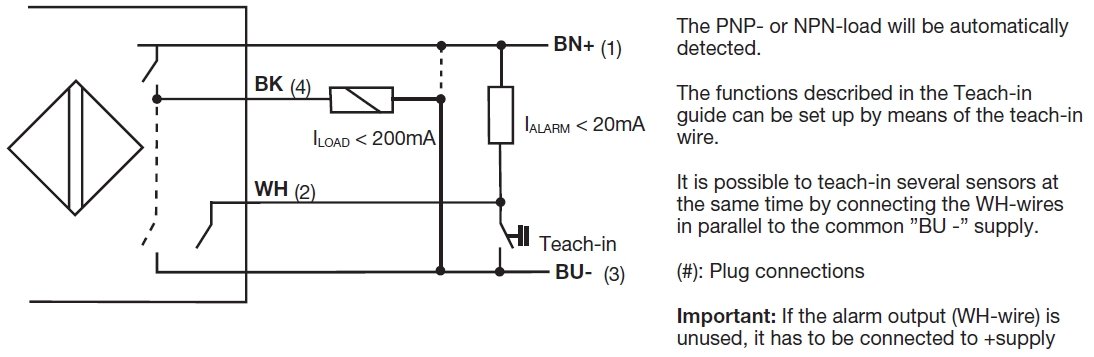The switching points can be altered by means of the teach-in function. 3-wire DC output with selectable make (NO) or break (NC) switching and NPN Alarm.