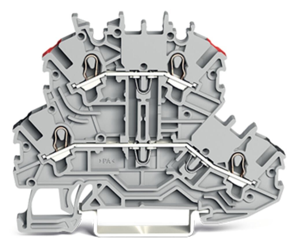 Seamless electrical installations are guaranteed with this double-deck terminal block (item number 2000-2201/352-000). The double-deck terminal block also functions as a through terminal block. Conductors should only be connected to this double-deck terminal block if their strip length is between 9 mm and 11 mm. Featuring conductor terminals along with Push-in CAGE CLAMP®, this connector is highly versatile. Our Push-in CAGE CLAMP® is a universal, maintenance-free connection solution for all conductor types, featuring a winning design: It allows direct insertion of both solid and fine-stranded conductors with ferrules without needing tools. No preparation is required; for example, crimping the conductor's ferrule is not necessary. This double-deck terminal block is suitable for conductor cross sections ranging from 0.14 mm² to 1.5 mm². It has two levels. Two potentials can connect using the four clamping points The gray housing is made of polyamide (PA66) for insulation. These through rail-mount terminal blocks are mounted using DIN-35 rails.