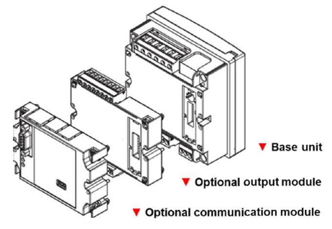 It is made up of a maximum of three components: the main unit that displays measurements on the LCD display and manages two alarms, and two accessory modules, one with digital outputs and the other for communication.