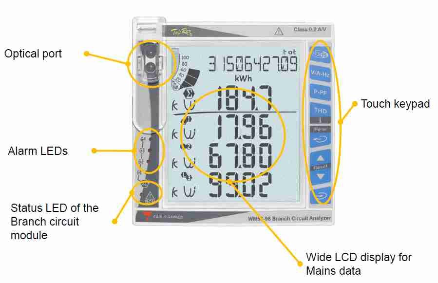 Using TCD12 split core current sensors, it can monitor up to 96 single phase loads or any combination of single and three-phase loads or two and single-phase loads for a maximum of 96 channels.