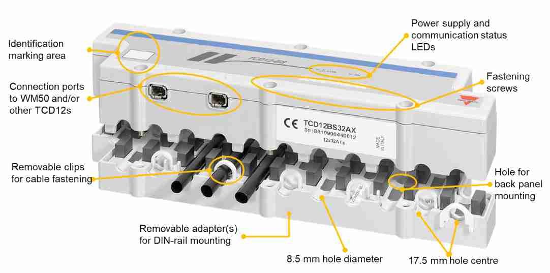 • Reduced installation time and errors. It is equipped with detachable terminals for all connections. It connects to 12-channel current sensors with proprietary cables.