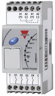 DIN relay output module to control AC or DC rollerblind motors that has been developed to be connected to and controlled by the smart-house system controllers.