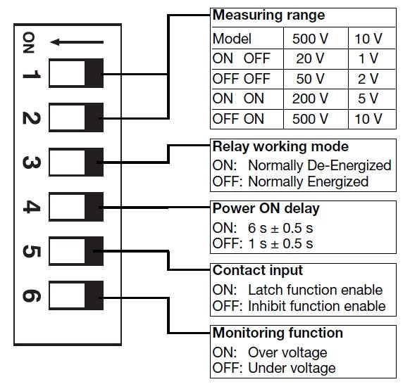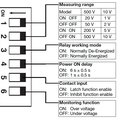 TRUE RMS AC/DC over or under voltage monitoring relay for measuring range from 0,1 to 500 V AC/DC (selection by DIP-switches). The DUA71CB.. has 3 potentiometer on the front side (for: voltage settings, for hysteresis setting and for alarm delay time). Also, there are DIP-switches (for measuring range, for relay working mode, for power on delay, for contact input and for monitoring function).