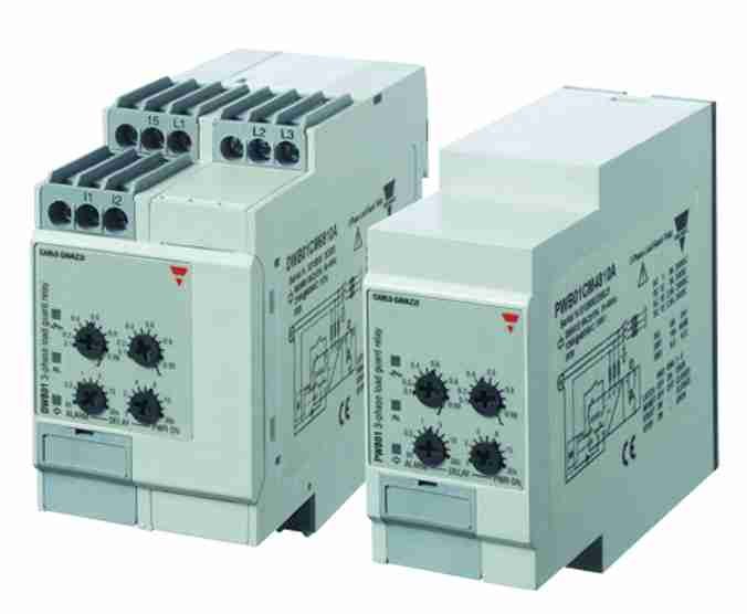 The relays monitor their own power supply voltage and the current of a balanced 3-phase system.