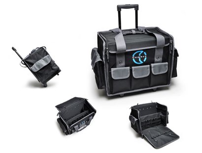 Practical trolley mounted tool bag made of robust fabric, with 2 separate internal compartments to neatly arrange hand tools.