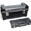 Plastic tool chest with small parts holder on the lid; Removable internal tool tray. Metal latches; Aluminium handle and padlock facility.Sufficiently robust to be used as a step when closed.
