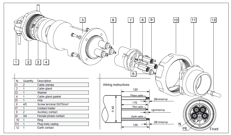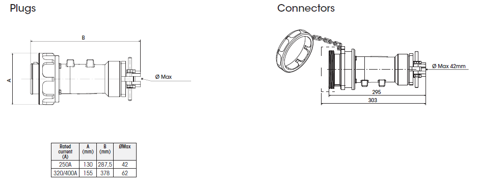 Mobile and flush-mounted sockets and plugs in aluminium alloy for heavy-duty applications, from 250A to 400A with IP67 protection rating, usable with voltage up to 1000V. The aluminium alloy body is reworked with a passivation treatment to improve the resistance to chemical agents. The coupling system of receptacles and plugs makes use of the Easy Contact technology for maximum contact performance over time and ensures easier connection and disconnection operations. Each connection is provided with a double pilot contact.