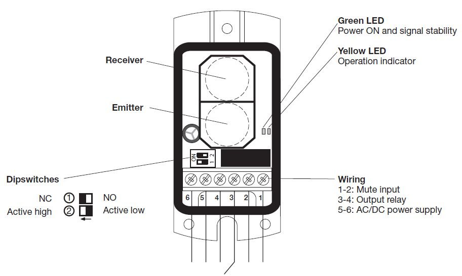 Dip-switches selectable for make or break function (relay output), and active high or low mute function for any regulations of industrial doors