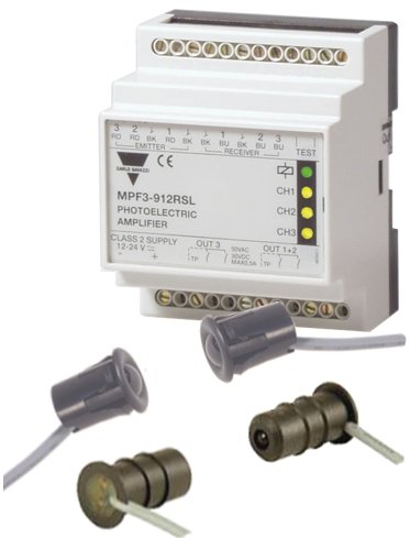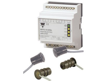 The MPFRS.. is a photoelectric amplifier system for DIN mounting (70 x 57 x 86 mm) that can handle from 1 to 3 couples of photo sensors (3 different types) for Through-beam function. The Snap-ON photo sensor can be mounted in material with a thickness from 0.6 mm and up to 2.25 mm, very easy and no adjustments are necessary.