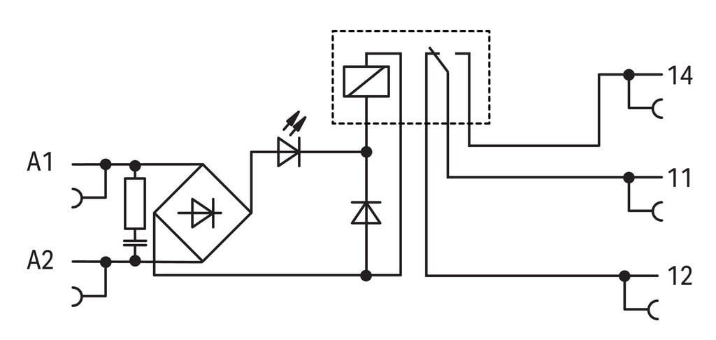 Relay module with yellow LED, input filters and 1 x NO+NC contact. Supply 230 V AC/DC. WAGO