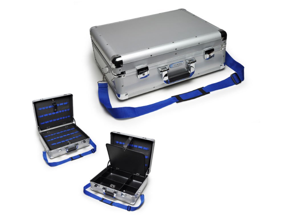 Aluminium case containing two panels with elastic tool holders and an internal pocket for holding documents or a tablet.