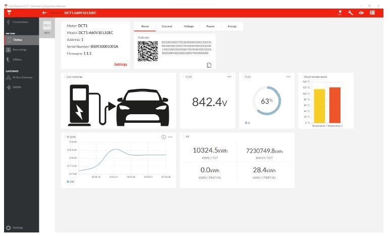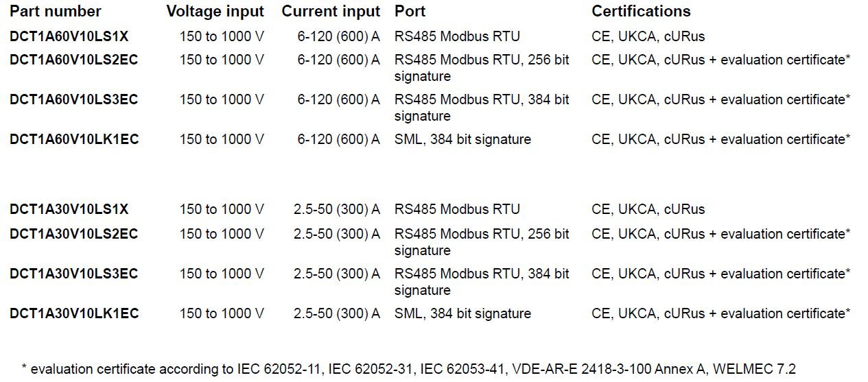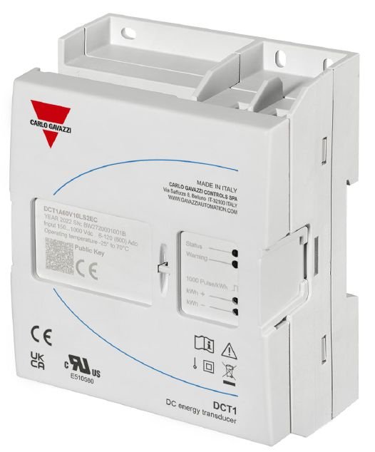 DCT1 is a direct connection energy transducer for DC systems up to 1000 V dc and current up to 600 A dc, equipped with Modbus RTU or SML communication port. Dedicated versions of the DCT1, provided with evaluation certificate, implementing 256- bit or 384- bit signature on Modbus RTU or 384- bit signature on SML, are suitable for installation on electric vehicle chargers that requires Eichrecht certification.