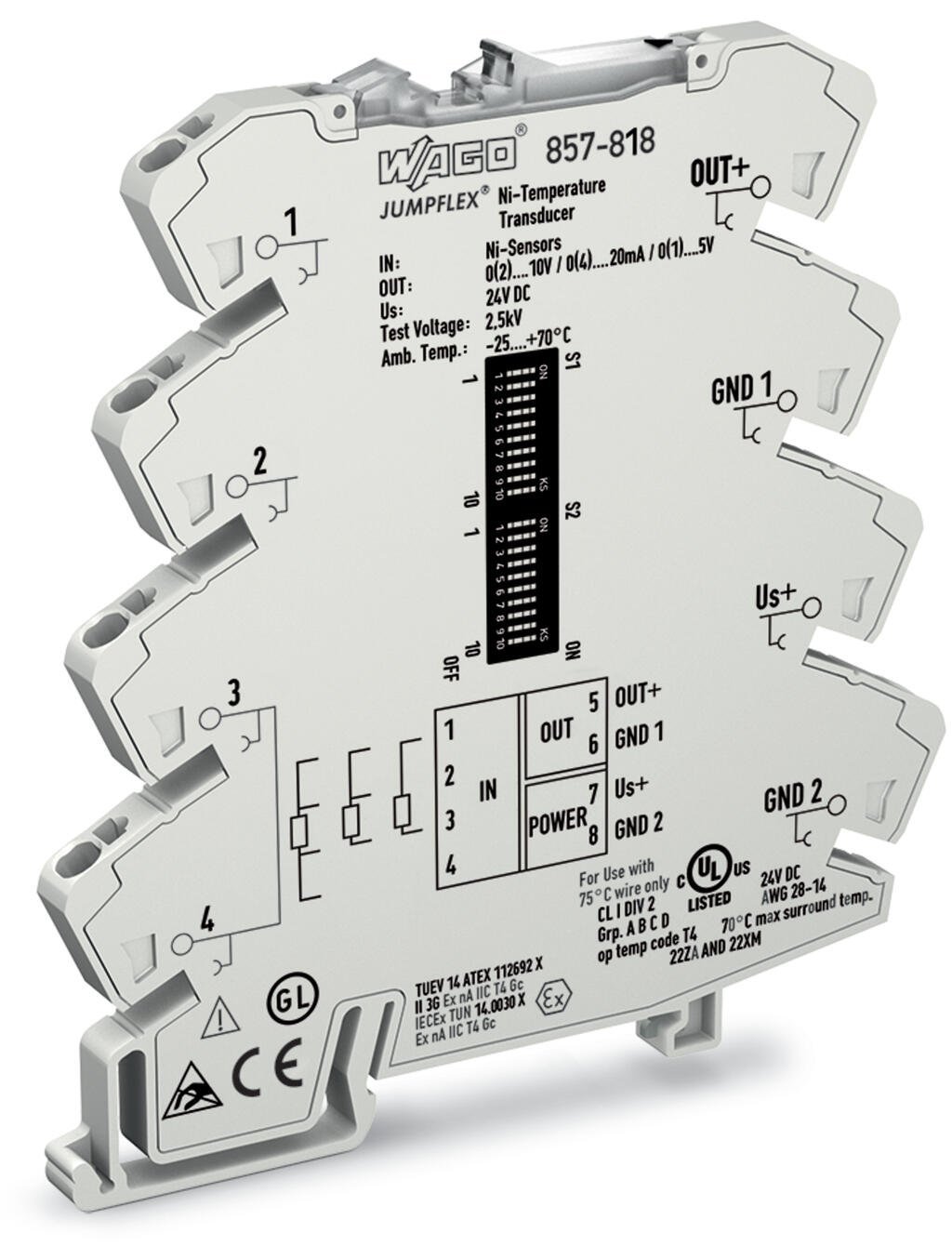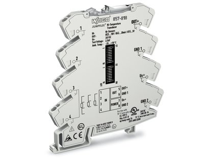 WAGO's Ni temperature signal conditioner (Ni = nickel) records signals from Ni sensors featuring all standard characteristics and converts the temperature signal into a standard analog signal at the output.