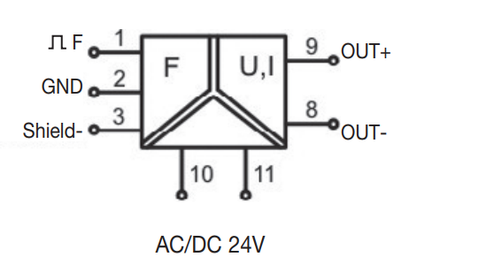This module is used to convert a frequancy signal, with either sinusoidal or square waveform, into a standard analogue signal (eg. 0…10 V, 0..20 mA, 4…20 mA). A microprocessor provides a high resolution, high stability and accuracy output signal and a dip switch gives the possibility to select a calibrated range of frequency measurement from 0 … 100 Hz up to 0…28.8 kHz.