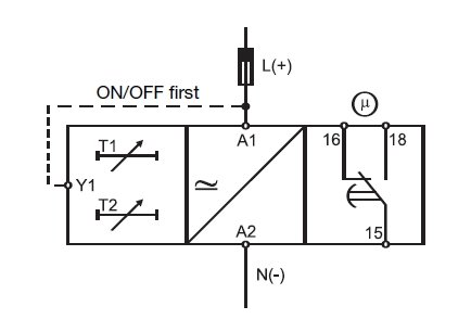 Individual selection of the time ranges from 0.1 s to 100 h. For mounting on DIN-rail.