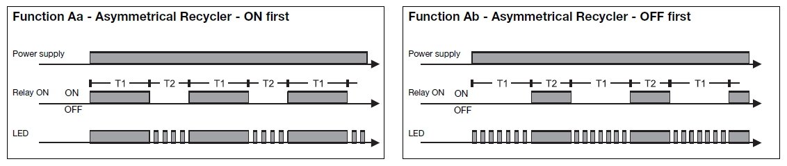 Combined function timer with asymmetrical recycler ON or OFF first selectable by connection between pins A1 and Y1.