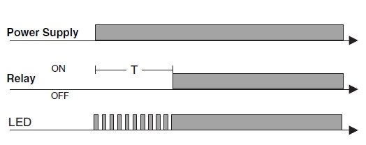 - Indications: 1 LED (power supply ON) + 1 LED (output relays ON- flashing when timing)