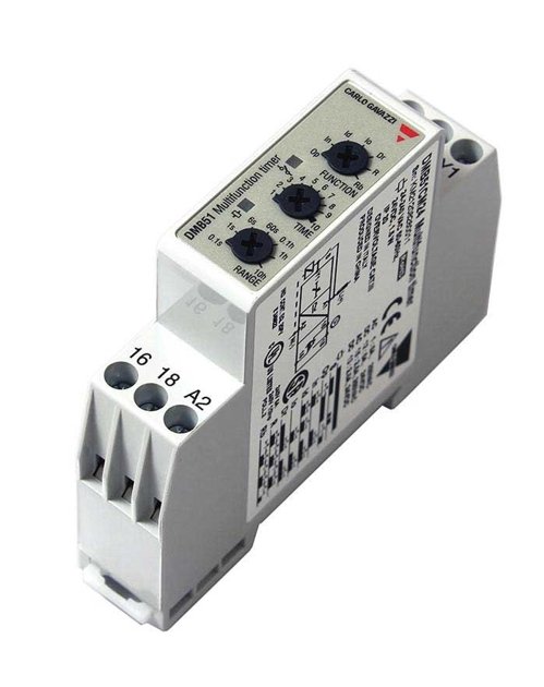 Multi-voltage symmetrical recycler (multifunction) mini-DIN timers with 1 or 2 contacts (0.1 s - 100 h). Carlo Gavazzi