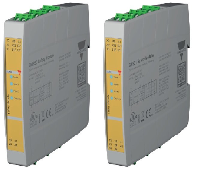 The SMS20 and SMS31 safety modules are designed in Category 4, Performance Level e in accordance with the Machine Directive EN ISO 13849-1 to monitor and control safely the safety circuits in applications with emergency stops, safety gates, safety magnetic switches, safety limit switches and electromechanical interlocks.