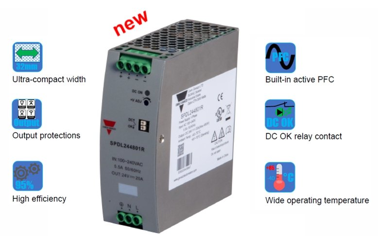 • Compact dimensions. SPDL can save up to 50% panel-width space thanks to its ultra-slim design. All models are just 32 mm wide, except 45mm for 480 W.