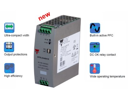 The SPDL series of DIN-rail mount power supplies encompasses high performance within an extremely compact footprint. Power ratings are available in 15, 30, 60, 75, 120, 240 and 480 W, with 12, 24 or 48 VDC output.The SPDL achieves high operating efficiency of up to 95% @ 230 VAC. Features such as DC ok output relay (for SPDL 240 and 480 W model) and built-in protection functions ensure a high degree of reliability during operation.