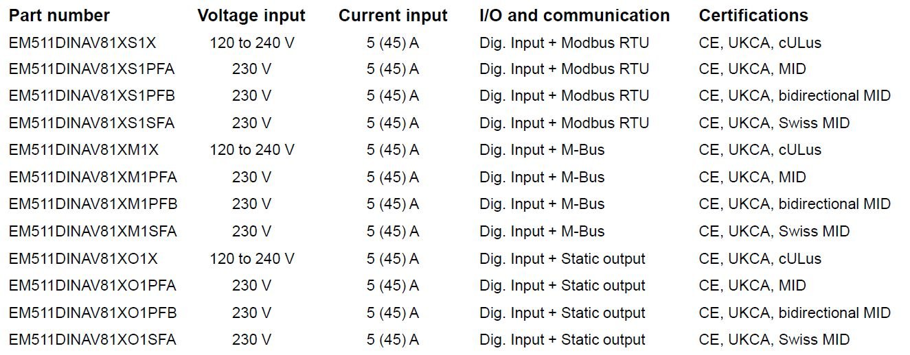 EM511...... is an energy analyser for 1-phase systems up to 240 V L-N and current up to 45 A. In addition to a digital input, the unit can be equipped, according to the model, with a static output (pulse or alarm), a Modbus RTU communication port or an M-Bus communication port. Mechanical keys but Backlit LCD screen.