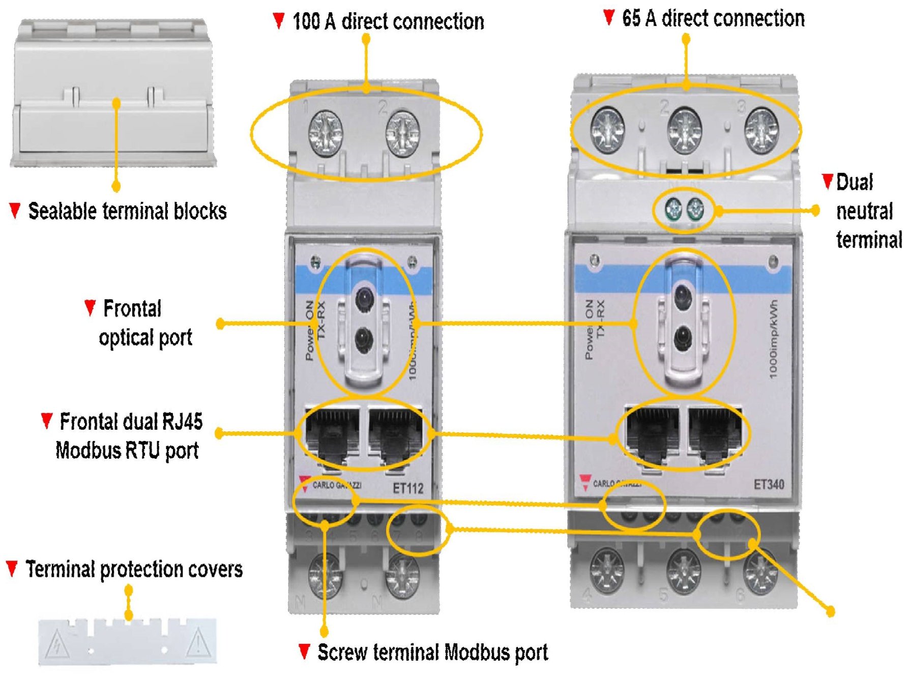 The ET112DS.. housing is for DIN-rail mounting and is provided with RS485 Modbus port available through screw terminals, dual RJ45 connectors or optical infrared communication port for maximum 247 transceivers on the same bus. Also a run-hour meter is available to link the energy to the relevant working hours.