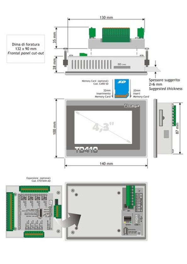 - TD410-AD: HMI 4.3" integrating soft-plc + 1 RS485 + 1 CANopen + 1 Ethernet + Movicon CE E.L.