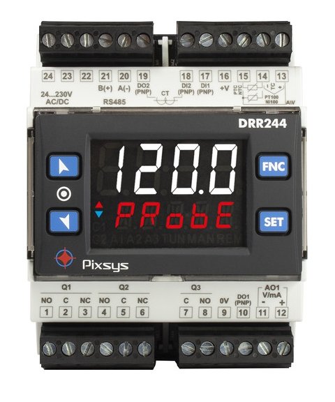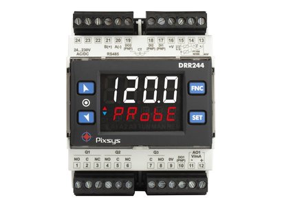 PID controller-converter, for DIN rail. Input: 1 dig+1 analog. Outputs: 3 relays+2 SSR+1 analog+2 auxiliary. PIXSYS