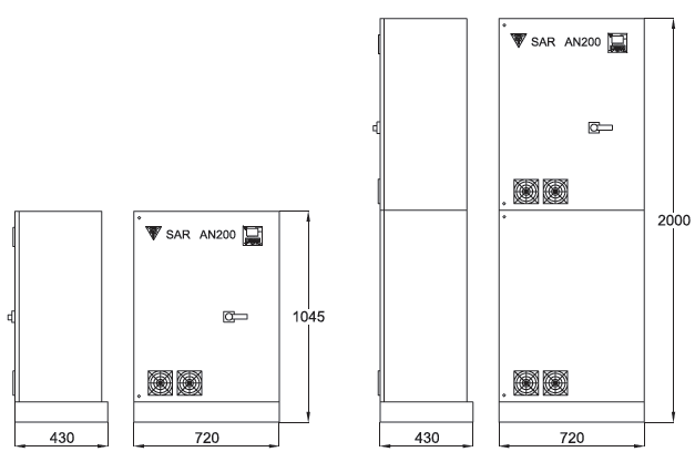 230V 50Hz (other available on request). Forced ventilation made by fun for each module with thermal relay for fun and block; are equipped with latest microprocessor regulator SARenergy type MRK with backlit LCD display multilanguage with text and icons and programmable alarm with possibility of remote control. The capacitors used, SARpro, are self-healing high energy density polypropylene metalized single-phase with overpressure safety device and discharge resistor, PCB free. For the Easy line we use capacitors with Un 440V rated voltage; for Techno Life line we use capacitors with Un 500V rated voltage; for Power Long Life line we use capacitors with Un 550V rated voltage and for Power TOP LIFE line we use capacitors with Un 600V rated voltage. AN200 series is made for floor installation, cable entry form bottom, maintenance form front plant, capacitors climbed on rack, metal case in a strong steel sheet and painted with epoxy resin RAL7035.