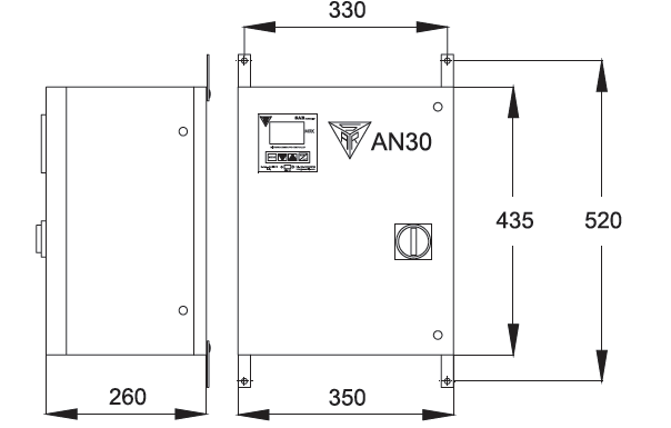 AN30 series is made for wall installation, cable entry form bottom, maintenance form front plant, capacitors climbed on threaded plate, metal case in a strong steel sheet and painted with epoxy resin RAL7035.