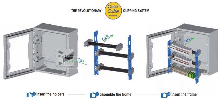 TAIS Cube series distribution and automation boards are a range of products in Palazzoli thermosetting GRP for heavy-duty applications with IP66 protection rating and resistant to UV rays. The system is composed of 7 sizes in each version with blind or transparent door. The accessories to use the board in typical configurations of automation are the back plate in steel sheet or in thermosetting GRP and the inner door in thermosetting GRP, equipped with opening handles and that can be installed at two different positions and fixed on both sides. In the distribution configuration, the steel frame allows for modular compositions with blind and windowed panels, depth-adjustable DIN rails and partial back plates. All elements are simply fixed with the "Click Cube" snap-in system. The wiring can be performed on the bench or directly inside the distribution board. The door is fixed to the back box with elements in nickel-plated brass and stainless steel located far from the edges and that allow an opening wider than 180°.