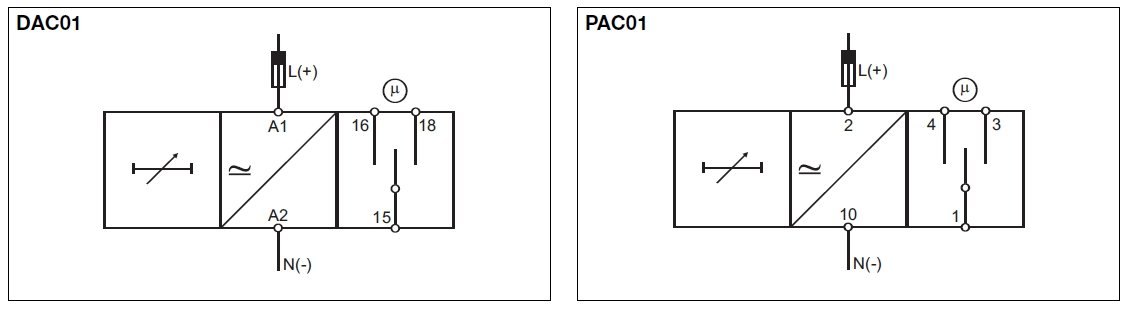 - Dimensions DAC01CM..: 22.5 x 80 x 99.5 mm, PAC01CM..: 36 x 80 x 94 mm