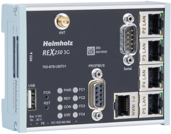 The REX 250 3G has a 3G modem (UMTS) via which the connection to the myREX24 V2 portal is established. The WAN interface, which is also available, can form a fail-over network in conjunction with the 3G modem. The integrated 4-port switch can be used to connect the Ethernet nodes of the machine to the router on the available RJ45 ports.