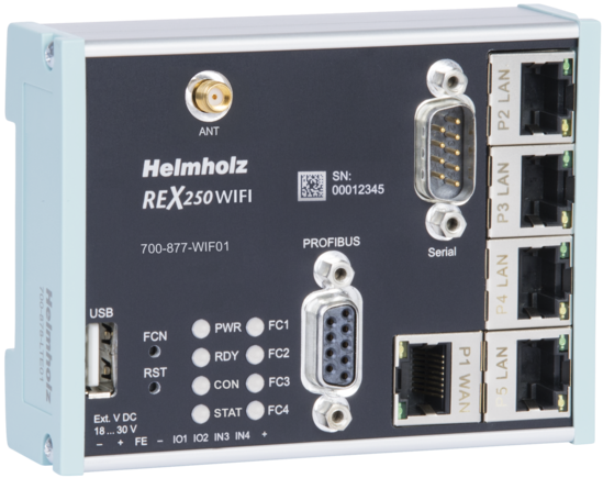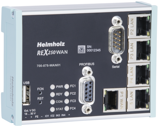 The REX 250 WAN has a WAN interface via which the connection to the myREX24 V2 portal is established. The integrated 4-port switch can be used to connect the Ethernet nodes of the machine to the router on the available RJ45 ports.