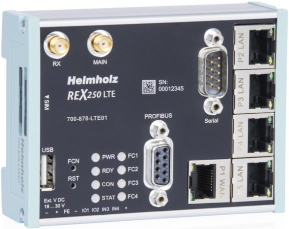 The REX 250 LTE has an LTE modem, which connects to the myREX24 V2 portal. The WAN interface, which is also available, can form a fail-over network in conjunction with the 4G modem. The integrated 4-port switch can be used to connect the Ethernet nodes of the machine to the router on the available RJ45 ports