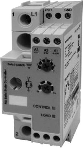 The RGS1P and RGC1P is a series of solid state relays (mounted on chassis or on an external heatsink) that give the possibility to control output power of 1-phase load with an analog control input.