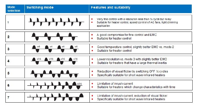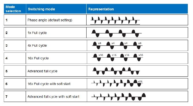 Switching modes, selectable through a front knob, allow phase angle control, full cycle control, advanced full cycle control specific for short wave infrared heaters and soft starting for limiting inrush current of loads having a high temperature coefficient.