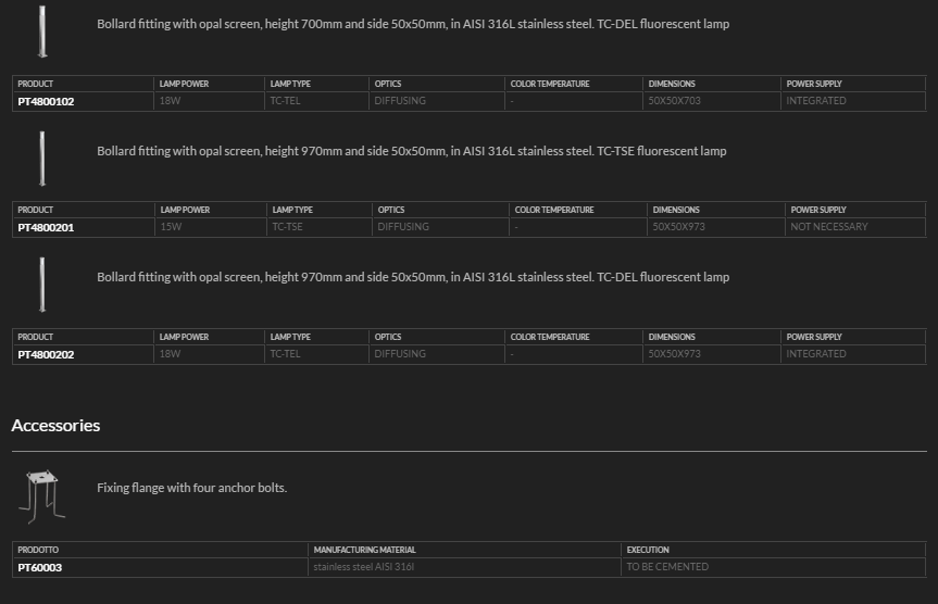 Bollard luminaires in stainless steel AISI 316L.