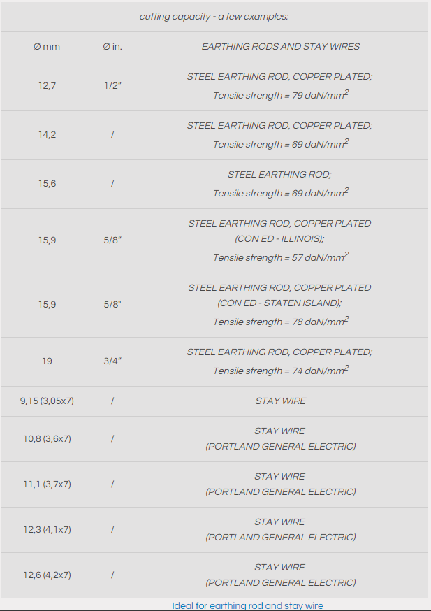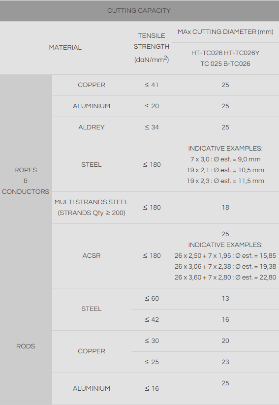 Hand operated hydraulic tool specifically designed to cut copper, aldrey, aluminum, aluminum-steel cables, stay wire and steel ropes having a max overall diameter of 25 mm and steel earthing rod up to 16 mm.