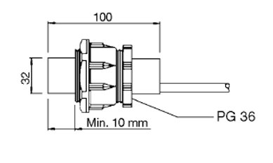Capacitive sensor in thermoplastic polyester for mounting in a PG 36 screw gland. Available with adjustable sensing distance and with/without built-in time delay (ON or OFF delay). The relay output ensures that the load can be driven directly.